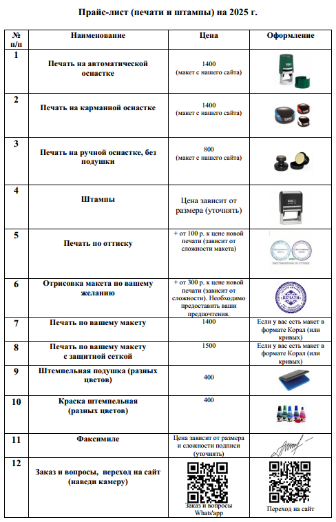 Цены на штампы зависят от их размера, уточняйте по телефону или через месенджеры (иконки для перехода в мессенджеры на главной странице).